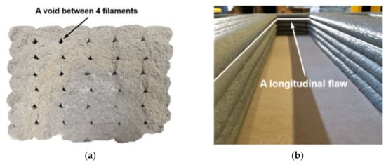 With no vibrator employed for further densification or compaction, small linear voids are likely to form between extruded filaments owing to the layer-by-layer extrusion method, resulting in anisotropic behavior [,,]. As defects in the printed structures, these linear voids (or inter-filament voids, shown in Figure 5) inevitably have an adverse influence on hardened properties of the 3D-printed cementitious materials. On the contrary, a certain amount of pump pressure in the extrusion process reduces the volume of voids inside each filament (namely intra-filament voids), providing benefits for the microstructure of the printed materials [,]. The combined effect of inter- and intra-filament voids (related to print quality and pump pressure, respectively) determines the hardened performance of freeform components, which is further discussed in the following sub-sections. Here, print quality can be defined as surface quality, dimension stability and bonding quality of the deposited material, all of which highly depend on fresh materials properties (i.e., extrudability, buildability, and open time) and printing parameters (including printing speed, printing time gap, and printing path).