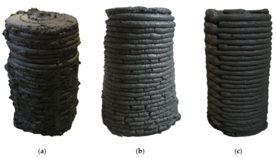 The printing speed balance between nozzle travel speed and material extrusion rate also contributes to density. Figure 6 compares the print quality of printed cylinders in three different extrusion settings. When the extrusion rate fits in well with a given nozzle travel speed, high print quality can be achieved, resulting in a high density of the printed components (Figure 6c). However, disturbance of the stated balance leads to poor quality of printing, and thus, a variation of density (Figure 6a,b). It can be concluded that the printing speed should be engineered and adjusted to prevent any over-extrusion and messy final printed objects.