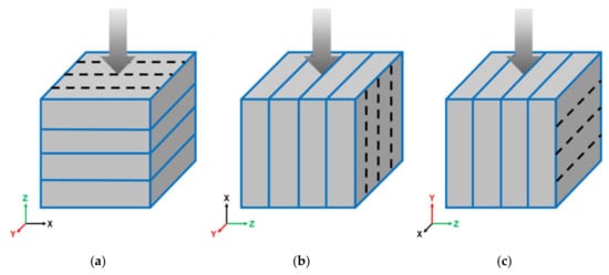 To enhance the understanding of anisotropic properties of the printed components, quite a few researchers [,,,,] have conducted compression tests for saw-cut cube specimens in three loading directions: perpendicular, longitudinal, and lateral directions (Figure 7). Apart from cube specimens, cylinder [] and prism [,] specimens were also utilized to evaluate the compressive strength of printed materials. However, for those cases, geometry, as well as dimensions, should be considered when analyzing the results from literature. Note that to obtain true results, plane surfaces of the specimens are required by grinding or capping prior to testing. In several research efforts [,,], only two loading directions rather than three were tested, which is required for consideration of the anisotropy of the printed structures.