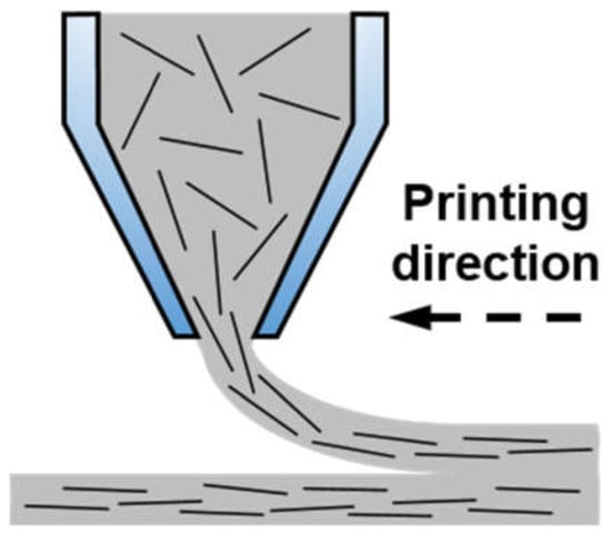 Apart from the size of the printing nozzle, its geometry would also influence the extrusion process. Roussel [] elaborated on the difference in material flow behavior between rectangular and conical nozzles: The deposited material would experience laminar or non-laminar flow in a rectangular or conical nozzle, respectively. In the case of laminar flow, the material is deposited as a stiff and non-deformed filament, which is desirable to retain its shape, while for non-laminar flow, it expands once deposited despite easier extrusion than the former case.