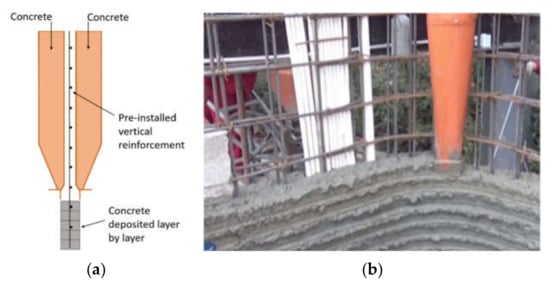 Moreover, there are numerous printing paths to generate a particular 3D digital element, and the choice of printing path would affect its density. Hambach and Volkmer [] studied the influence of different printing paths on density and explained that specimens printed in a parallel shape show higher density than those printed in a crosshatch shape. They also applied the concept of “hierarchy” [,,] to the 3D-printable cementitious materials to obtain a denser printed structure with high strength and material efficiency. This was done by printing a parallel shaped shell and a crosshatch shaped core with carbon fiber-reinforced cement paste as a hollow formwork, and casting simple and inexpensive mortar as a filling agent into the printed formwork to fill the voids after 24 h. Note that the formwork lateral pressure exerted by the cast mortar becomes significant as the height of the designed component increases; as such, higher mechanical performance or longer curing time of the printed formwork is needed. Such hierarchical structures in 3D-printing are worth further investigation.