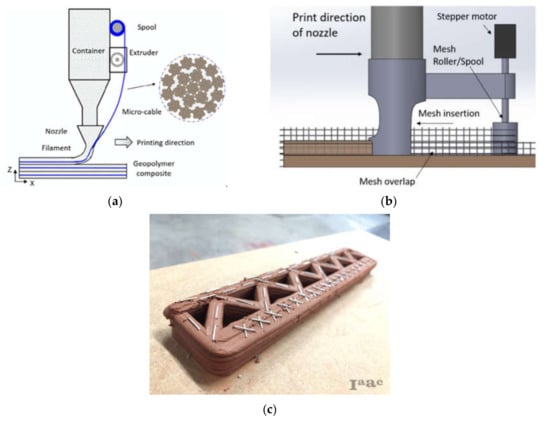 - Ma, G.; Li, Z.; Wang, L.; Bai, G. Micro-cable reinforced geopolymer composite for extrusion-based 3D printing. Mater. Lett. 2019, 235, 144–147. [Google Scholar] [CrossRef]