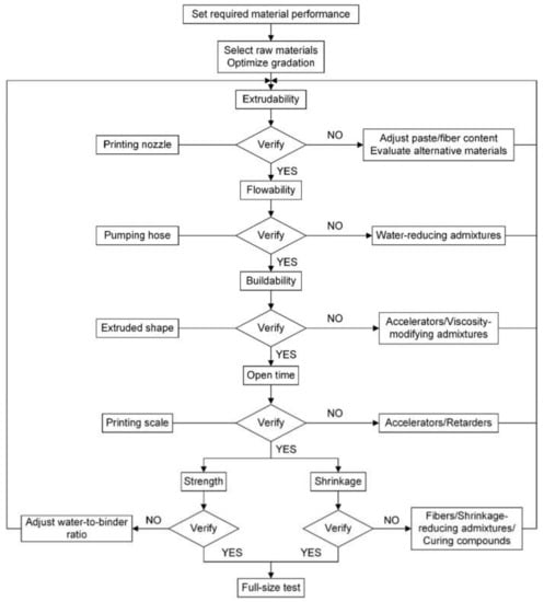 Although a few review papers on this topic can be referred to [,,,,,], this paper contains a much more detailed discussion on the fresh and hardened properties of 3D-printable cementitious materials, especially their definitions, experimental testing, and internally/externally effective factors. Section 2 covers the fresh properties, including flowability, extrudability, buildability, and open time. The evolution of rheological properties that are related to fresh properties is further explained. Section 3 presents thorough descriptions of the hardened properties, such as density, compressive strength, flexural strength, tensile bond strength, shrinkage, and cracking. Existing reinforcement methods are also discussed. In Section 4, a summary of experimental testing and effective factors for each property is provided, and a step-by-step mix design procedure is proposed. Finally, Section 5 identifies future research needs in 3D-printed cementitious materials.