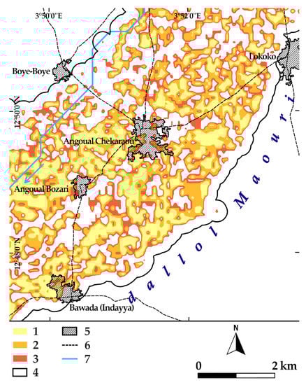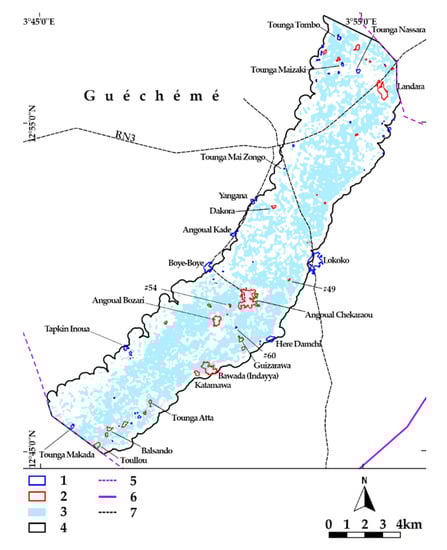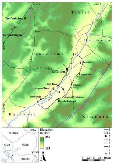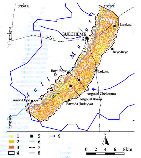 In the past, the Maouri Dallol was crossed by a stream that originated in Northern Niger and flowed into the Niger River 910 km downstream. Today, its regime is intermittent and its endorheic behavior feeds a wetland with an aquifer close to the surface [78]. Heavy rains flood the valley both due to surface flow and water table rise. In Guéchémé, the Dallol crosses one of the most densely populated zones of Niger. Of the 87 settlements identified in 2019, one is large (Angoual Chekaraou), six are medium, 21 are small, and 60 consist of a few houses (Table 3).