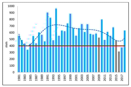 Annual accumulated rainfall (blue) (Guéchémé and Guéchémé Centre de Santé stations) between 1981 and 2018, critical rainfall threshold of 400 mm/year (red), incomplete data (grey).