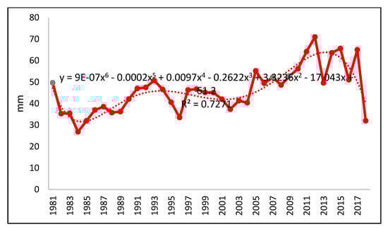 In the 1980s, Guéchémé had a dry period, followed by a wet decade and then an alternation of wet (with a declining trend) and dry years. The accumulated rainfall remained above 400 mm per year, a critical threshold for dry farming [79,80,81], except in the years 1984, 2016, and 2017 (Figure 3). One of the most significant changes in rainfall over the last forty years has been the increase in value (expressed in mm) of rainfall falling in the 95th percentile, or extreme rainfall. These precipitations increase from 40–50 mm/day (in the nineties) to today’s 60–70 mm/day (Figure 4).