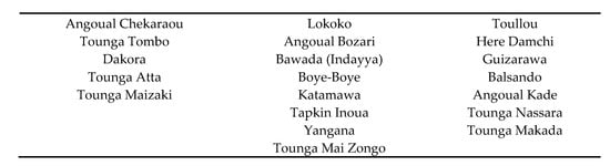 - Institut National de la Statistique. Niger: Répertoire National des Localités (RENALOC), 1st ed.; Ministère des Finances: Niamey, Niger, 2014; p. 718.
