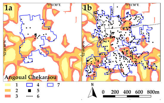 Building expansion in the FPA in Angoual Chekaraou between 2009 (1a) and 2019 (1b): high (1), medium (2), and low (3) probability of flooding, built-up area (4), buildings with iron sheet roofs (5), unpaved tracks (6), and 2009 built-up area (7).