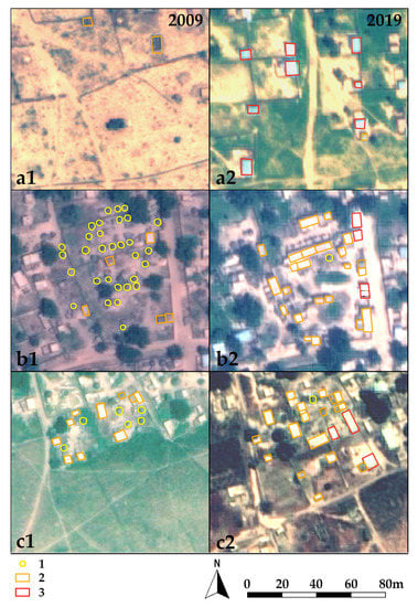 Details of the three main settlement dynamics of straw (1), mud (2), and corrugated iron sheet (3) roofs in Angoual Chekaraou (a1,a2), Lokoko (b1,b2), and Toullou (c1,c2) between 2009 and 2019.