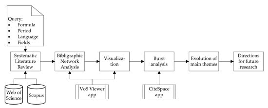 The SLNA methodology (Figure 1) consists of two main steps. Systematic literature review (SLR) is the first step. It allows to determine the scope of research and generate studies for use as input in the next step (namely, bibliographic network analysis and visualization). The SLR approach [34,35] provides identification and selection of the most appropriate papers that will be included in further analyses of secondary data. SLR differs from other literature review methods due to its principles of transparency, inclusivity, explanatory and heuristic nature which allow for a more objective overview of search results, and elimination of any bias and errors [36]. To formulate research questions and define a scope of the analysis, Denyer and Tranfield [36] proposed the use of the Context, Intervention, Mechanism and Outcome approach (CIMO). The second step is bibliographic network analysis and visualization (BNAV) that allows to determine the development of major existing topics and emerging research trends using network analyses, e.g., citation network analysis (CNA), co-occurrence of keywords and burst detection analysis. CNA is one of the main areas of bibliometric research that uses various methods of citation analysis to establish relationships between authors or their studies. It assumes that the citation network is a system of channels that transform scientific knowledge or information. It is possible because scientists from one organization tend to cite each other to place their study in the field of previous or existing knowledge [37]. Typically, a network analysis is performed to map the range and structure of the discipline when discovering key research clusters [18].