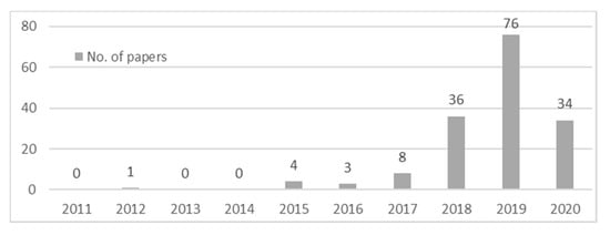 Figure 2 shows that the interest in the topic was not significant in the period 2012–2017. In 2018, there was a visible increase in interest in combining both concepts (36 papers). In 2019, another essential increase was recorded—over 100% compared to 2017 (76). Such a dynamic growth in interest in this topic underlines its current importance and relevance. In the first 3 months of 2020, 34 articles were identified, so if this trend continues, it will mean another increase in the number of papers compared to the previous year.
