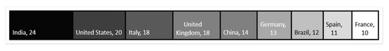 As shown in Figure 3, most of the papers were created in Asia (India—15%, China—9%), Europe (Italy—11%, United Kingdom—11%, Germany—8%, Spain—7%, France—6%) and North and South America (United States—12%, Brazil—7%). Other articles constitute a small percentage of the total papers. A dispersion of studies between continents and countries may show that the discussed topic is very important and has a global significance. An additional argument is the fact that many countries (e.g., USA, Germany, China, UK) are pursuing national strategies for the development of the Fourth Industrial Revolution, of which sustainability is a very important aspect.