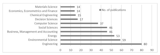 The selected papers are dominated by one subject area: engineering (80 articles). It proves that in most articles the authors focused on aspects related to manufacturing in which the integration of Industry 4.0 and sustainability concepts enables the creation of new engineering solutions to achieve more sustainable and green production. The next most numerous subject areas regarding the analyzed topic are environmental science (59) and energy (53). This may indicate that these papers concentrated on using Industry 4.0 technologies and tools to protect the natural environment, increase energy efficiency and achieve sustainable development goals. Next up are articles related to business, management and accounting (46), social sciences (46) and computer science (37). These articles examine the impact of Industry 4.0 on business management issues based on the triple bottom line (TBL) framework. The impact can be measured using IT tools/algorithms based on Industry 4.0 technologies. Other subject matters are less numerous in terms of articles and cover many different fields (although all of them are related to engineering and management), which may indicate the interdisciplinary nature of the issue of sustainability and I4.0.