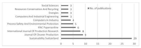 The largest number of articles have been published in Sustainability (Figure 5) by far. It is a consequence of the thematic scope of the journal, one of the main themes of which is to improve sustainability through Industry 4.0. The number of papers in other journals is smaller, but all of them focus on the issues of cleaner/green production and manufacturing, production and operations management considering environmental and sustainability research and practice. The number of selected papers was classified in terms of applications and types (Table 2).