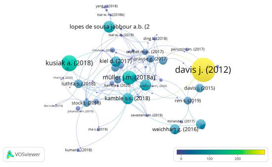Particularly noteworthy are the papers [23,55] which despite their publication in 2019 have relatively large number of citations. In addition, the first article belongs to the largest citation cluster. Usually, papers get more citations in the years immediately following their publication. In this case, it may mean that these papers are breakthrough studies setting out further research directions. The paper [23] is an ordering of existing knowledge related to the use of BDA in sustainable smart manufacturing (SSM). The article contains a conceptual framework of BDA in SSM from the perspective of product lifecycle. The paper also discusses the potential applications and key benefits of BDA in SSM and sets challenges and future research directions for this area. The paper [55] is also treated as a conceptual article which proposes the framework of risks for implementing Industry 4.0 in the context of the triple bottom line. Based on a literature review and interviews with experts, a list of risks in five categories (ecological, social, environmental, technical/IT, legal/political) was developed and discussed.