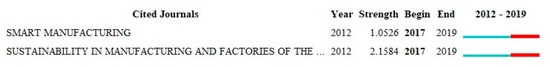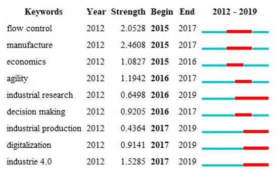 CiteSpace is a Java application for detecting, visualizing and analyzing emerging trends and transient patterns in scientific literature [51]. It was created as a software tool for progressive visualization of domain of knowledge [52]. CiteSpace focuses on searching for critical points for the development of a given discipline or field of knowledge, more precisely pivotal and intellectual turning points [51,53]. The tool is useful in the case of temporal and structural analyses of various networks (e.g., authors’ keywords) based on scientific studies. CiteSpace is equipped with a burst detection algorithm that allows to detect a series of keywords. The result of the algorithm execution is a list of popular keywords over time (topic bursts). CiteSpace was used to perform a burst detection analysis.