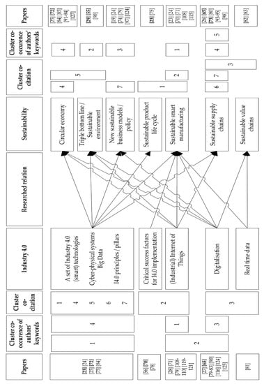The CNA shows that research related to the integration of sustainability and Industry 4.0 is fragmented and multidisciplinary. The identified research topics were initiated in countries that run programs related to the Fourth Industrial Revolution: the USA, China, Germany, the United Kingdom, emphasizing their leading role in creating the basis for research on the integration of the concepts of sustainability and Industry 4.0. As a result of the CNA, seven clusters were outlined.