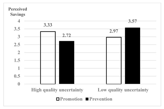 The ANOVA test results indicate that quality uncertainty level and regulatory focus had no significant effect on perceived savings. In other words, two main effects of quality uncertainty level and regulatory focus were not statistically significant, with p > 0.01. However, the interaction effects of quality uncertainty level and regulatory focus were significant, with p < 0.01 (see Figure 2).
