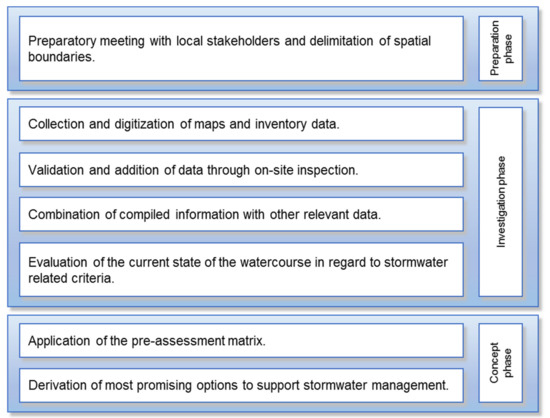A step-wise process to identify and pre-assess the suitability of former watercourses to support (urban) stormwater management was developed. The process shown in Figure 1 is divided into three phases following structures used in planning processes [29]. In the (1) preparation phase the problem and the framework conditions are defined. In the (2) investigation phase data is collected and combined into one database. In the (3) concept phase the gathered information is used to pre-assess the watercourses and to reveal the best options for their reactivation and future usage.