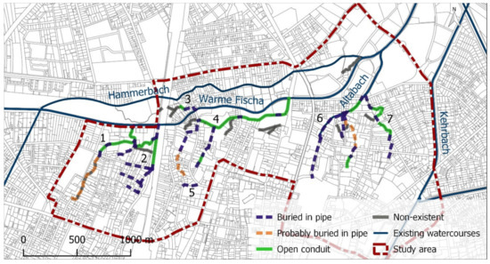 In the identified areas of potential former watercourses, on-site investigations were performed. On-site investigations were further used to validate the existence of former watercourses in the area and to gather additional information on their condition. In total 31 sites were inspected. At 14 sites the former watercourses were buried in pipes. At nine sites dry open channels were identified. Partly buried and partly open former watercourses were found at five sites. At two sites the former watercourses were not accessible as they are partly located on private property. At one location, no indication of a former watercourse could be identified. The identified former watercourses were mainly dried up. Only at one site at watercourse 6, some ponding water was visible. Figure 3 shows the existing as well as all identified former watercourses in the investigated area. In total seven watercourses were distinguished with a total length of 4600 m. For three sections with a total length of 730 m, the state of the watercourse could not be identified. These were, therefore, excluded from further analysis.
