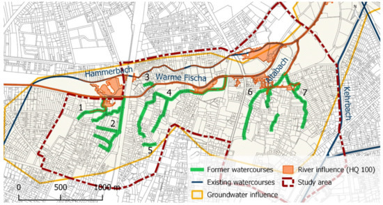 Overview of groundwater and river influences in the study area with the numbered former watercourses (based on [31]).