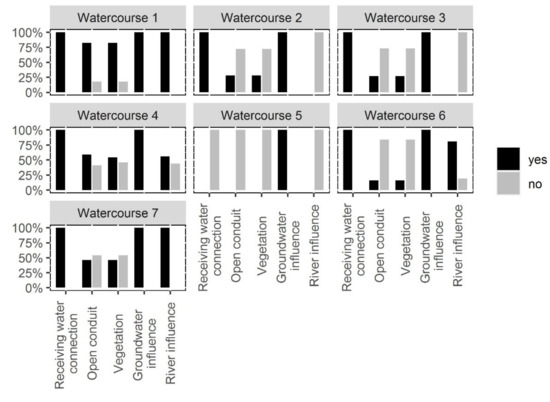 In the following step, the current state/condition of the identified former watercourses was described considering the five stormwater related criteria. Figure 5 shows the proportion of the different states of individual watercourses. From the seven watercourses, six are still 100% connected to the receiving water, while one is not connected at all. In two watercourses the main part of the watercourse is an open conduit. Almost all open conduits are covered with vegetation. In the other five watercourses, the piped sections predominate. As mentioned before all watercourses can be influenced by groundwater as the groundwater table is close to the surface in the whole area. In four watercourses river influence was identified in the main part of the watercourse due to the overlap with flood zones.