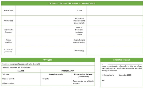 For the design of the data collection sheet, 10 subcategories of use were considered based on those described in the Spanish Inventory of Traditional Knowledge Relating to Biodiversity [39]. Each of these subcategories was quoted verbally during the workshops for each of the plants, while the interviewer (student) wrote the information given by the informants. The following subcategories relate to the types of uses that a plant can have for humans: 1. Human food; 2. Animal feed; 3. Medicine for humans; 4. Animal medicine; 5. Toxic or poisonous; 6. Fuel; 7. Used to make tools and other utensils; 8. Used for traditional parties or events; 9. Used as a building element; 10. Other uses.
