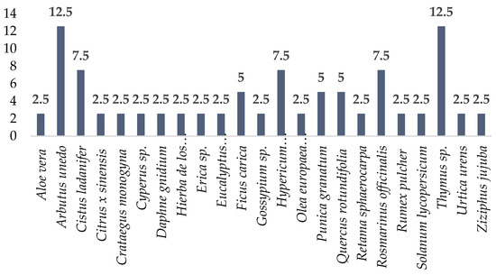 Information was collected from 23 different plants—9 cultivated (Aloe vera (L.) Burm. F., Citrus x sinensis (L.) Osbeck, Ficus carica L., Gossypium sp., Olea europaea subsp europaea var. sylvestris (Mill.) Lehr., Punica granatum L., Rosmarinus officinalis L., Solanum lycopersicum L., and Ziziphus jujuba Mill.), and 14 wild plants (Arbutus unedo L., Cistus ladanifer L., Crataegus monogyna Jacq., Cyperus sp., Daphne gnidium L., Erica sp., Eucalyptus camaldulensis Dehnh., Heliotropium europaeum L., Hypericum perforatum L., Quercus rotundifolia Lam., Retama sphaerocarpa (L.) Boiss., Rumex pulcher L., Thymus sp., and Urtica urens L.), some of which appeared more frequently than others (Figure 5). Among the most represented were Arbutus unedo and Thymus sp., indicating that these species are of great interest to the ethnobotanical identity of Sierra Grande.