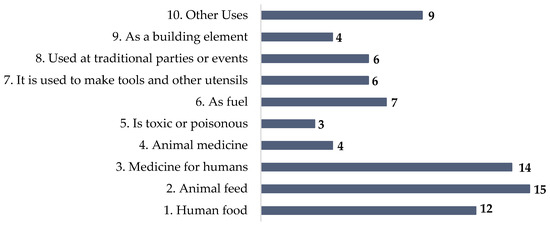 A total of 80 uses were obtained, the majority of which were, in order of majority of use: 2. Animal feed, 3. Medicine for humans, and 1. Human food (Figure 6). The maximum number of uses obtained for the same species was 8, and this figure was only achieved for Arbutus unedo, followed by Thymus sp. with 7 and Crataegus monogyna with 6. From the set of extracted information, we also observed that the most commonly used parts of the plant were the Leaves (L) and Stems (St), which were consumed from more than 13 of the 23 total plants. Least used were the Seeds (S), which were only used for three species (Ficus carica, Retama sphaerocarpa, and Urtica urens). Flowers (F) and Fruits (Fr) were also used for more than 40% of species (Appendix A).