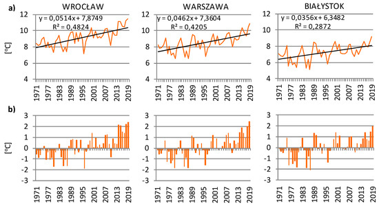 Mean annual air temperature 1971–2019 with the trend (a) and deviation from the multiannual values 1981–2010 (b) in selected stations in Poland: Wrocław, Warszawa and Białystok.