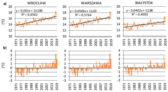 Mean air temperature during the vegetative period (April–September) in the period 1971–2019 with the trend (a) and deviation from the multiannual values 1981–2010 (b) in selected stations in Poland: Wrocław, Warszawa and Białystok.