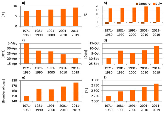 Mean air temperature in the year (a) and in January and July (b); the dates of the beginning (c) and end (d), and duration (e) of the active growth period of >10 °C; and the sum of active temperatures (SAT) (f) in 10-year-long periods in Poland. Years 1971–2019.