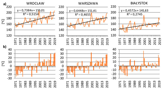 Mean sum of active temperatures (SAT) in the period 1971–2019 together with the trend (a) and deviation from the multiannual values of 1981–2010 (b) for selected stations in Poland: Wrocław, Warszawa and Białystok.