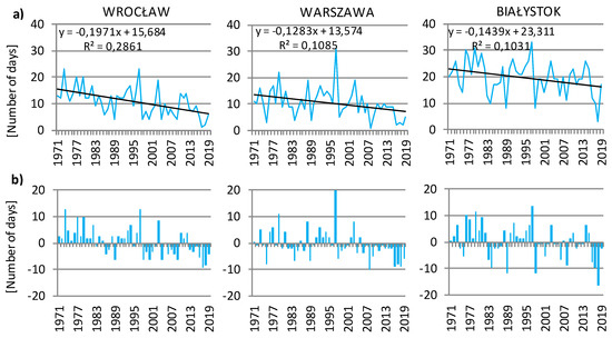 Mean number of days with frost at 2 m agl (a) in Poland in the period 1971–2019 with deviation (b) from the multiannual values of 1981–2010 in selected stations in Poland: Wrocław, Warszawa and Białystok.