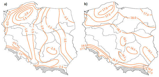The dominanting effect of the warm oceanic air masses from the west and the cool continental masses from the east makes air temperature isotherms in January longitudinal, from 0.0 °C along the lower course of the Odra River and on the shores of the Baltic Sea to −3.5 °C in the Suwalskie Lakeland (Figure 7a). According to Bosak [42], areas where the temperature in January is not lower than −1.5 °C are suitable for relatively safe cultivation of Vitis vinifera L, without the necessity of covering the vines in winter. In January, the isotherm of −1.5 °C determined for the period 1971–2019 runs from the north to the south, almost through the centre of Poland, along the lower course of the Vistula river, through Toruń, Konin and further towards Bielsko-Biała. However, it must be emphasised that in recent years (2000–2019), there has been a shift in the isotherm of −1.5 °C towards the east. In turn, in July in the period of 1971–2019, the latitudinal course of isotherms is determined by sun angle and altitude asl. The mean values of air temperature in this month range from 17 °C in the higher parts of the Pomeranian Lakeland to 18.5 °C in the central lowland area of Poland, and locally they can amount to 19 °C (Figure 7b). Therefore, almost the whole area of Poland meets the viticulture criterion of air temperature in July of >17 °C specified in the literature on this subject.