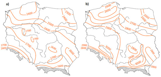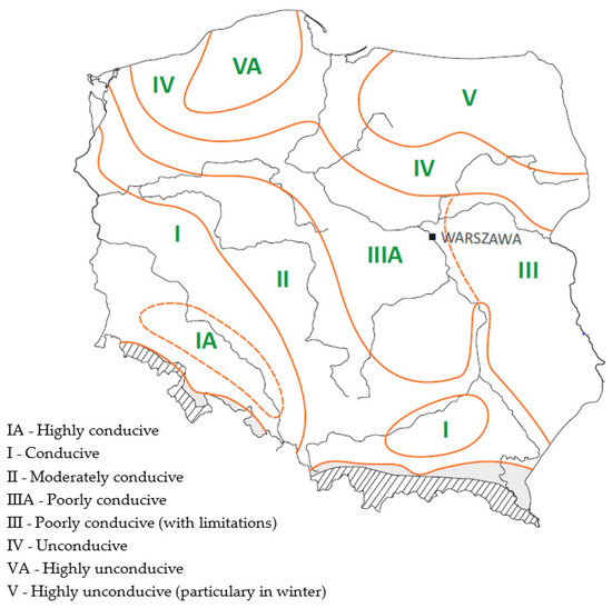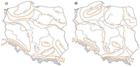 In turn, during the vegetative period, the air temperature conducive to viticulture, as given by the literature on the subject, should be >14 °C [42,69]. Such temperature values were identified for approx. 80% of the country’s area, yet the most favourable conditions in this period are recorded in the south-west region of Poland and the Sandomierz Basin (Figure 7c).