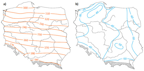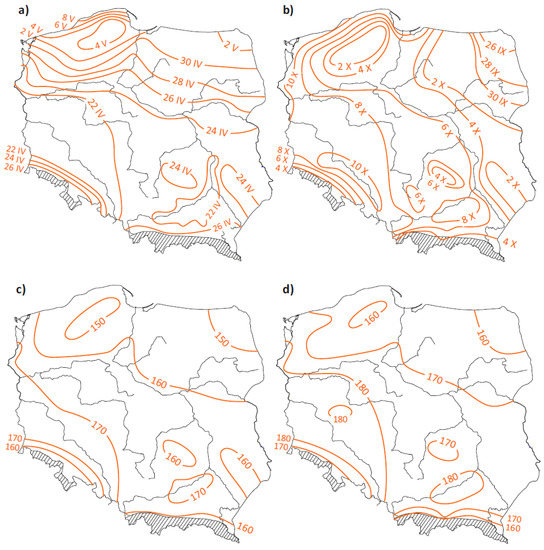 In Poland, the average date of the beginning of the period with a temperature of more than 10 °C is 26 April, yet the earliest date is recorded in the basin of the Odra River (before 22 April), and the latest date in the zone of the Baltic Sea coast (after 4 May) (Figure 8a). The vicinity of the Baltic Sea and the elevation of the Pomeranian Lakeland cause the spatial differentiation of the dates of the beginning of the period with a temperature of >10 °C to be greater in Pomerania than in other areas of Poland [70].