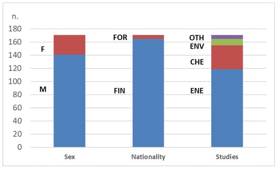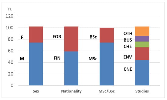 Background variables for full-time students (2018–2019). Sex: male (M), female (F); nationality: Finnish (FIN), foreigners (FOR), master’s students (MSc), bachelor’s students (BSc); studies: energy (ENE), environmental (ENV), chemical (CHE), business (BUS), other (OTH).