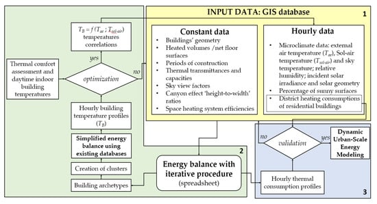 Starting from the thermal balance at the building scale (according to ISO 52016-1:2017 and ISO 52017-1:2017), the thermal flux equations have been simplified using the available data at the urban scale. Then, the energy performance of buildings was based on the following assumptions: