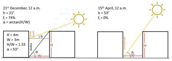 The incident solar irradiance on walls (Isol,wall) was assessed considering the hourly variation in the shadow percentage for each building (ξ) as a function of the solar height h and the canyon height to distance ratio H/W (Figure 2). When h is less than the urban canyon angle arctan(H/W), the shadow quota of the building wall is equal to the tan(h)/(H/W); instead, if arctan(H/W) is greater than/equal to 1, there is no shadow on the building wall: