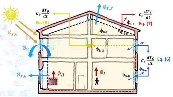 In this energy balance model, three thermodynamic systems (in Figure 3) were considered and the following assumptions were made: (i) the temperatures of the thermodynamic systems were uniform; (ii) the heat transmission through the building elements was one-dimensional and thermal bridges were neglected; (iii) the energy need for humidification or dehumidification was neglected; (iv) the energy balance equations can be applied also to groups of buildings with similar behavior.