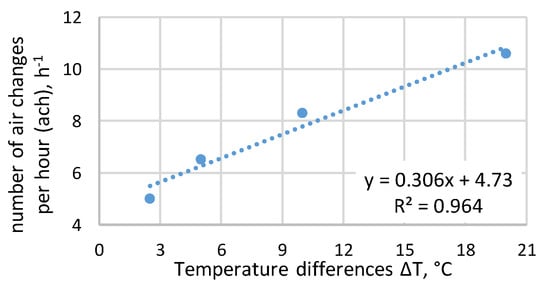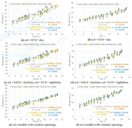 - As far as the type of ventilation is concerned, three scenarios were assessed in order to evaluate the quota of heat losses due to natural ventilation. Firstly, an air exchange per hour (ach) of 0.5 h−1 was assumed to be constant for all residential buildings during the day (24 h) resulting from infiltration. In the second scenario, ach was assumed to be variable during the daytime (with ach equal to 0.62 h−1) from 7 a.m. to 9 p.m. and the nighttime (with ach equal to 0.30 h−1) from 10 p.m. to 6 a.m. due to the use of shutters. In the last scenario, the thermal balance was implemented and the ach was assumed to be variable, considering a quota for infiltrations (3/4 h) and a quota for window opening (1/4 h) when the temperature inside the buildings exceeded the comfort temperature (TB > 22 °C).