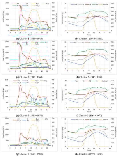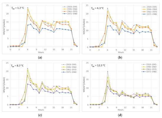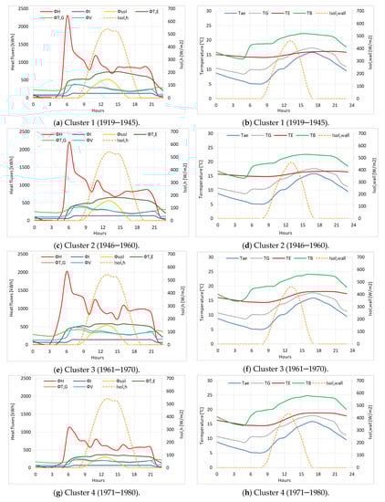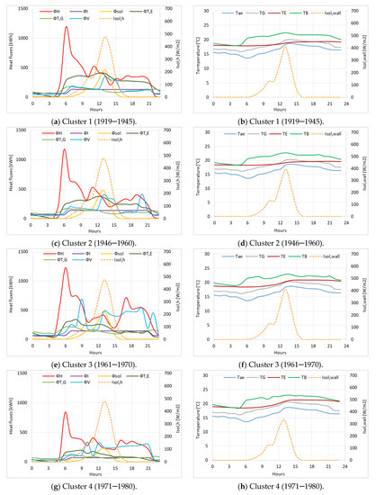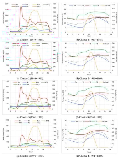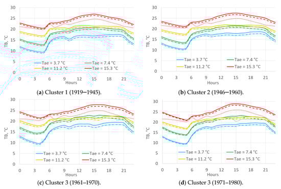 - The energy balance with an iterative procedure was designed, dividing residential buildings into four clusters (homogenous groups) according to the hourly consumption profiles and the construction periods. The profiles of the building temperature—simulated using the energy balance equations—were compared with the indoor comfort temperature (according to ISO 7730: 2005 and EN 16798-1:2019). To further optimize the model, the internal temperature of the buildings was corrected, taking into account the climate conditions (external air temperature and sol-air temperature).