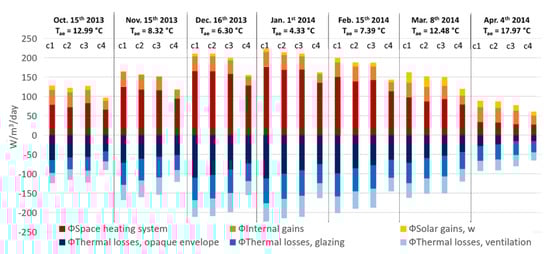 Figure A1 shows the comparison between the simulated and measured monthly thermal consumptions. The simulated thermal consumptions have been calculated using the three dynamic thermal balances: (i) a constant air change rate n = 0.5 h−1; (ii) a variable ach during the daytime and nighttime; (iii) a variable ach considering a quota for infiltrations and a quota for window openings.