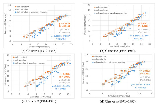 Comparison between the simulated and measured monthly thermal consumptions, distinguishing ach = 0.5 h−1 (in orange), ach = 0.62 h−1 during the daytime, ach = 0.3 h−1 during the nighttime (in grey), and variable ach with window openings (in blue).