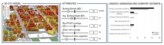 Urban-scale energy models allow reliable estimates of the energy consumption of buildings to be made, which can in turn be used as a base for planning a resilient city [4,5]. Since the energy consumption of buildings is related to the local climate conditions and the urban morphology, these models have to consider the urban context (especially in dense, built-up areas) [6]. Therefore, energy simulation models and tools should take into account not only the characteristics of buildings, but also other urban energy-related variables [7]. It is necessary to consider several factors at different scales, since the energy consumption of buildings depends on a dynamic interaction between the envelope elements, technical systems, building surroundings, outdoor climate, and human behavior [8]. The already existing energy models and tools are able to simulate building consumption at an urban scale by assembling different sub-models [9]. However, these energy models only consider a few of the variables that actually influence the energy consumption of buildings at the urban scale [10], such as the presence of greenery [11], the albedo [12], the canyon effect [13], or the local climate conditions [14]. Indeed, designing these models at an urban scale is a complex task, since the available data usually lack some building-scale details; there is the need to make the right trade-off between model precision and the management of large amounts of data at different scales [15].