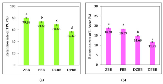 Data processing by an ANOVA test indicates statistically significant differences in the retention rate of TPC among ZBB, PBB, DZBB and DPBB (p < 0.05), as shown in Figure 1a. The effects of blackberry processing and the drying of raw byproducts on the retention rate of L-AsAc, reported as the value recorded for blackberries, are shown in Figure 1b. Although a large amount of L-AsAc passed into blackberry juice, the raw and dried byproducts still retain about 12-19% of the L-AsAc content found in blackberries.