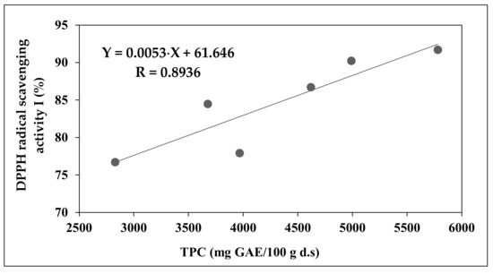 The correlations obtained after simple linear regression model application for DPPH radical scavenging activity and the TPC of blackberries as well as raw and dried processing byproducts are displayed in Figure 2. We recorded a significant positive correlation between the DPPH radical scavenging activity expressed as I (%) versus TPC (the correlation coefficient R = 0.8936). Thus, the redox properties of phenolic compounds which allow them to act as hydrogen donors and reducing agents are primarily responsible for the DPPH radical scavenging activity.