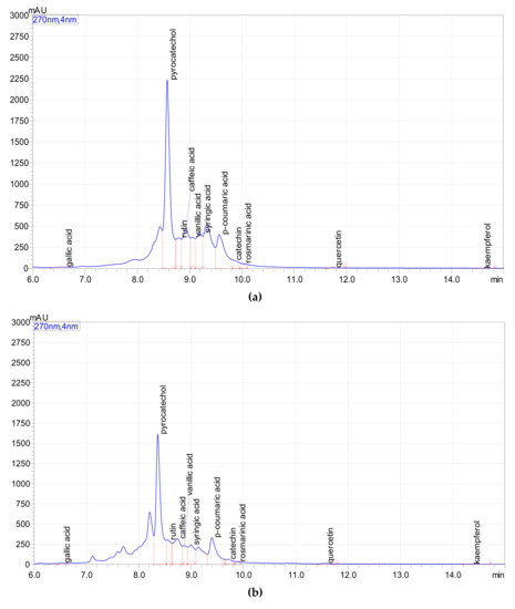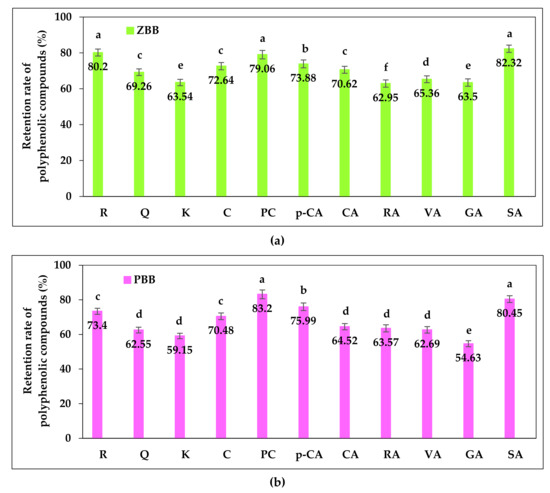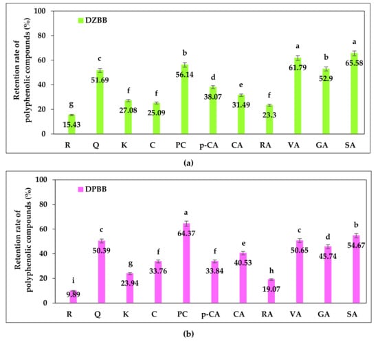 Regarding the significance of the differences found in the retention rate of polyphenolic compounds identified in DZBB (Figure 5a), it can be noted that there were no statistically significant differences (p > 0.05) between VA and SA, PC and GA as well as between K, C and RA. Moreover, for DPBB, as shown in Figure 5b, there were no statistically significant differences (p > 0.05) between Q and VA as well as between C and p-CA. Apart from that, the retention rate of the other polyphenolic compounds identified in DZBB and DPBB was significantly different (p < 0.05).