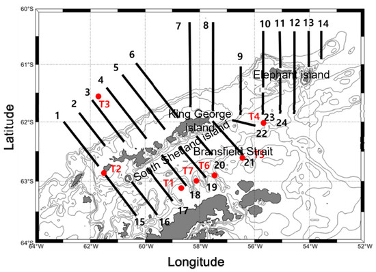 The survey area covered the west of South Shetland Islands, Elephant Island, and Bransfield Strait in the south. The survey area consisted of the coastal area, formed by the continental shelf within 200 m of the islands, the tidal front at the interface of different types of water, and the offshore area where the water became deeper.